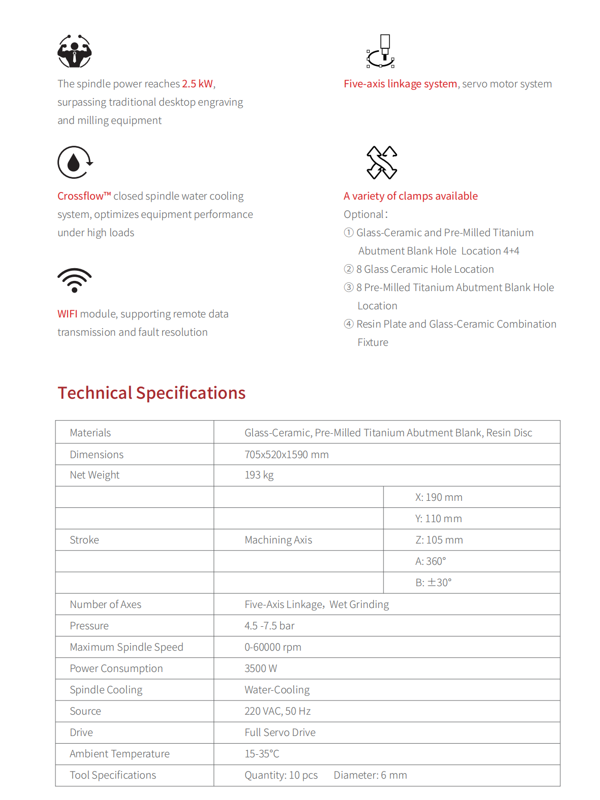 A versatile five-axis wet grinder for dental glass-ceramic blocks, resin blocks, and pre-milled titanium abutment blanks.