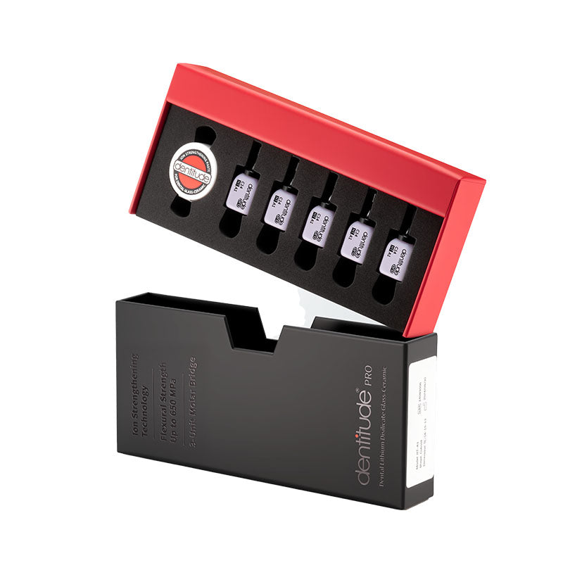 A ground breaking glass-ceramic with a flexural strength up to 800 MPa. As strong as zirconia, yet still has the excellent bonding strengt, teeth-matching surface hardness and elastic modulus of glass-ceramic.