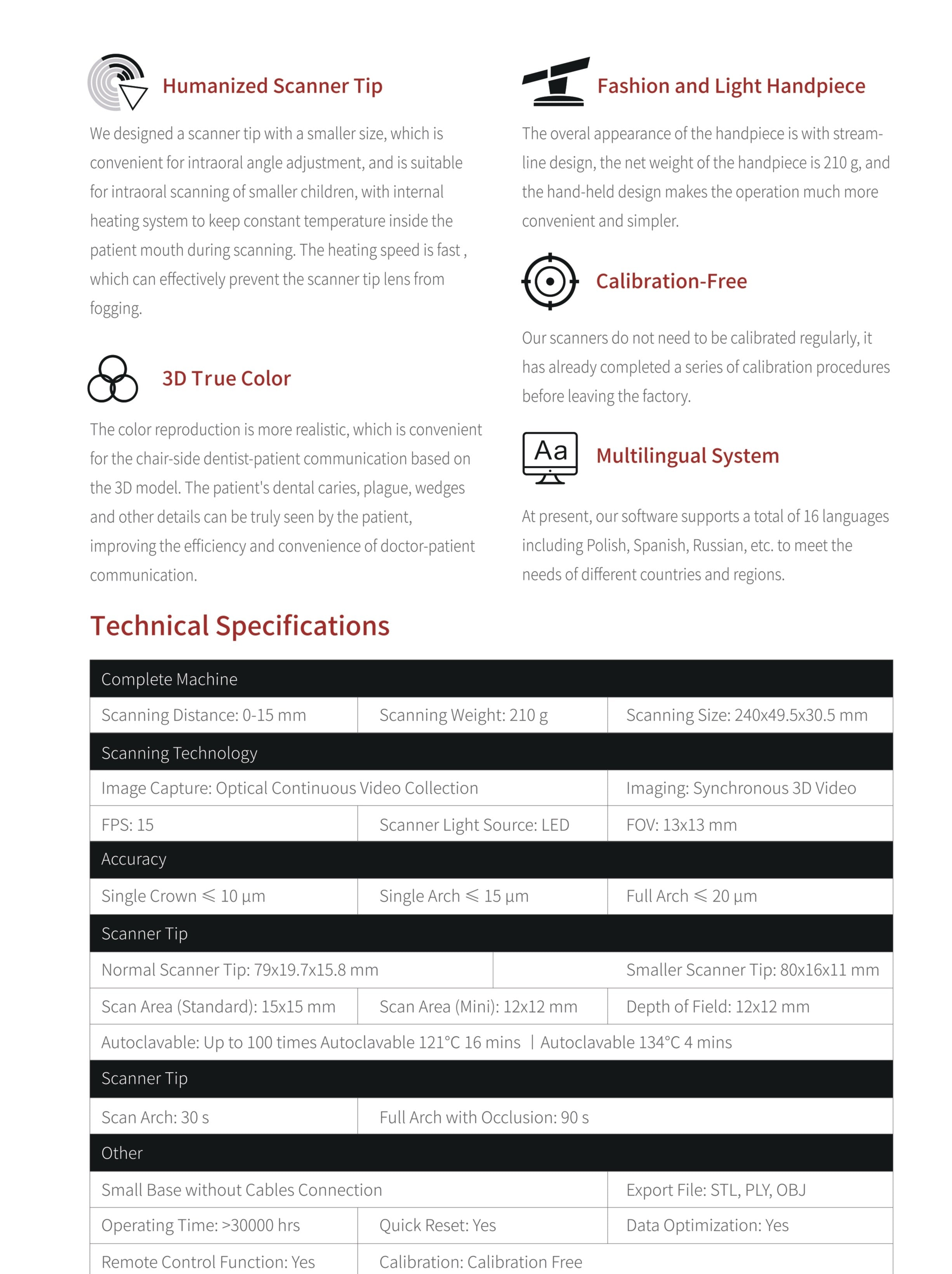 The appearance of the handpiece adopts an overall streamlined design with 210 grams, which is more convenient for dentists to operate. (Multilingual System: Chinese, English, French, Spanish, Russian, Portuguese, Italian, Greek, Polish, Romanian, Japanese, Korean, Turkish, Czech, German,Hungarian)
